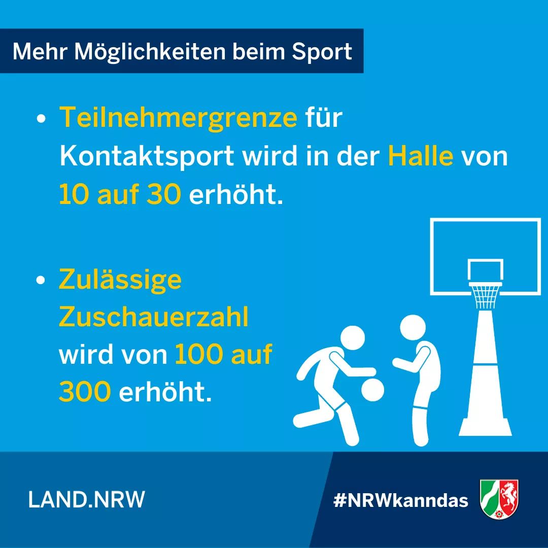 Die Personenbegrenzung beim Kontaktsport in der Halle wird von zehn auf 30 Personen erhöht. Auch die zulässige Zuschauerzahl wird von 100 auf 300 erhöht.
