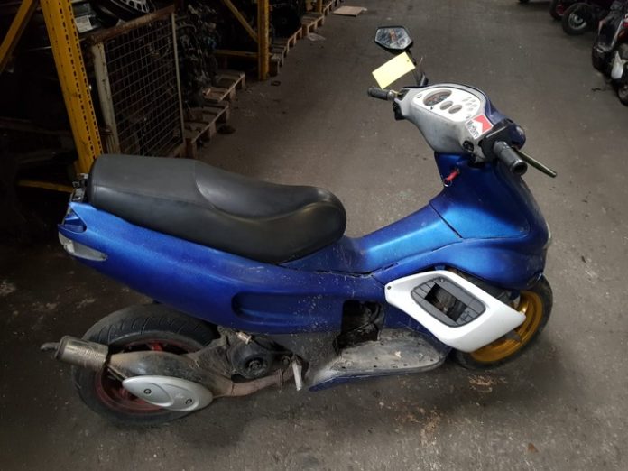Der Roller der Marke Gilera ist metallic-blau lackiert und hat silberne Seitenteile. Auffällig an dem Zweirad ist eine goldene Felge vorne, eine rote Felge hinten und ein „Marlboro“-Aufkleber am Lenker.
